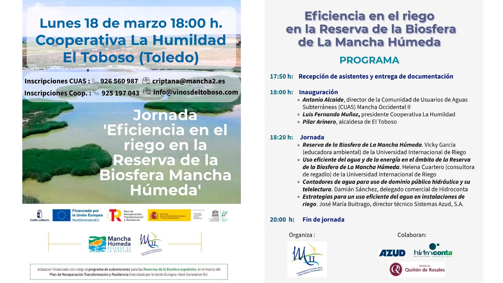 Esta vez en La Mancha, a los agricultores que pertenecen a la CUAS Mancha Occidental II, y dentro de un proyecto denominado Eficiencia en el riego en la Reserva de la Biosfera de la Mancha Húmeda.